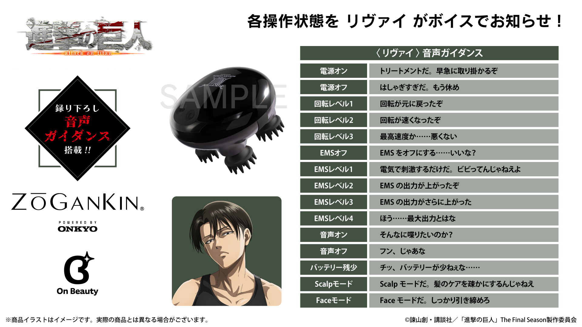 本コラボレーションモデルは、本体天面に調査兵団の紋章「自由の翼」と「Survey Corps」を配置し、「リヴァイ」による新規録り下ろしボイスを搭載。電源オンやオフ、Scalpモード、Faceモード、回転レベル、EMS等、各操作に応じてガイドしてくれるオリジナルボイス計15ワードを楽しみながら頭皮や表情筋のケアが可能です。尚、描き下ろしイラストマイクロファイバークロスを付属します。
