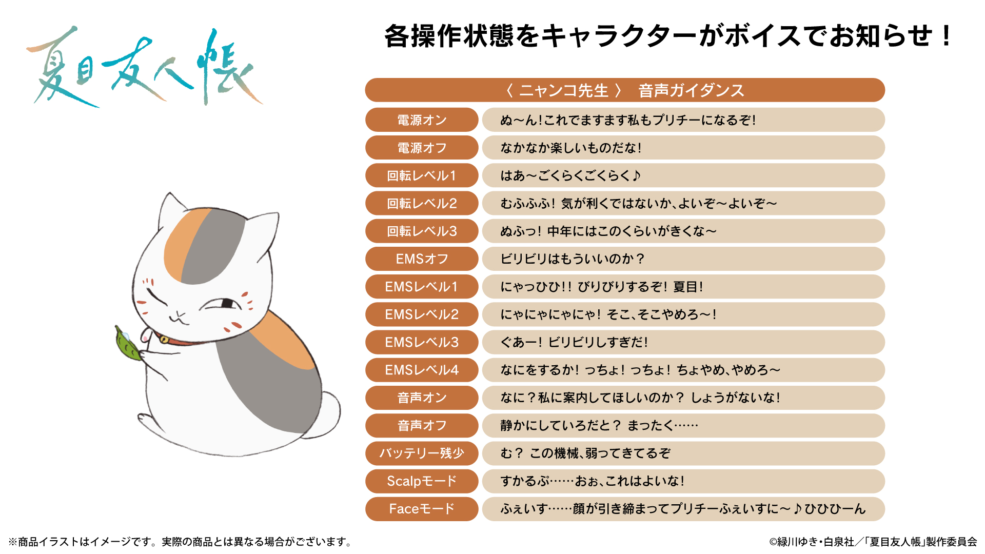本コラボレーションモデルは、本体天面に「ニャンコ先生」モチーフアイコン、作品ロゴを配置し、「ニャンコ先生」(CV:井上和彦)新規録り下ろしボイスを搭載。電源オンやオフ、Scalpモード、Faceモード、回転レベル、EMS等、各操作に応じてガイドしてくれるオリジナルボイス計15ワードを楽しみながら頭皮や表情筋のケアが可能です。