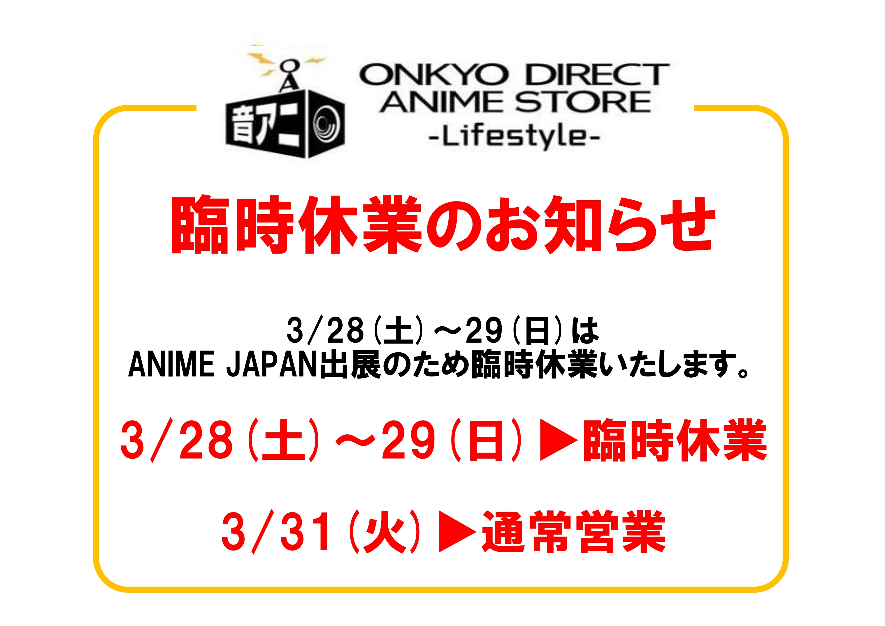 3月28日(土)〜29日(日)AnimeJapan2026出展のため、臨時休業いたします。